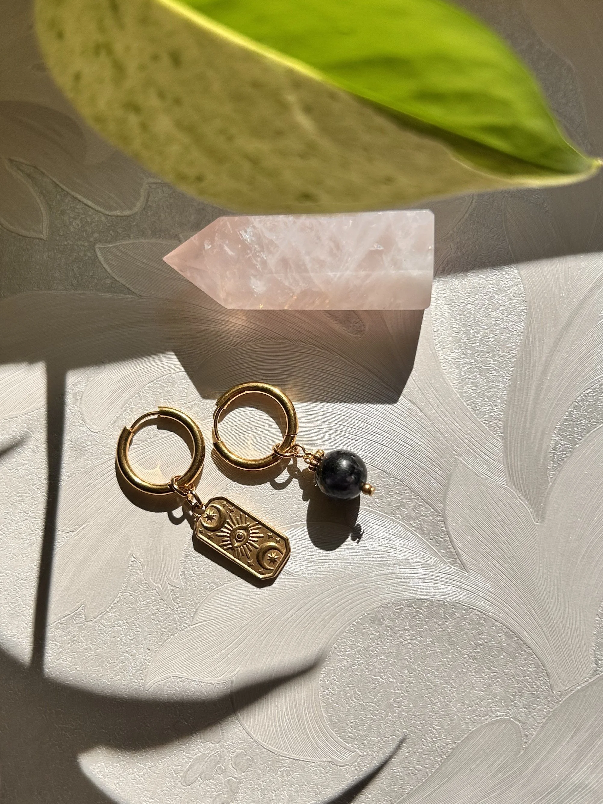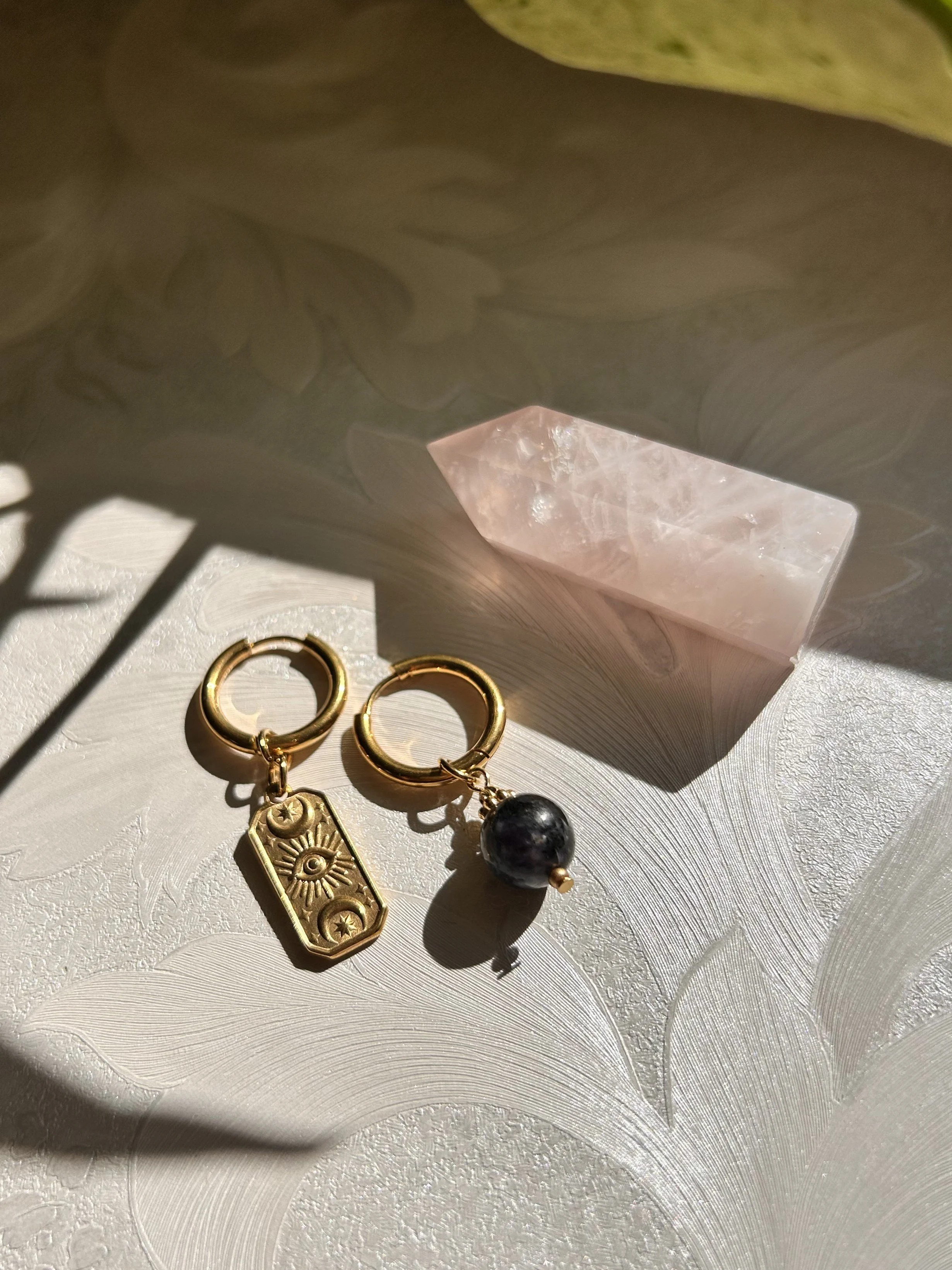 Chaque pierre est une pièce unique : la forme et la couleur peuvent légèrement varier d’une paire de boucles d’oreilles à l’autre.